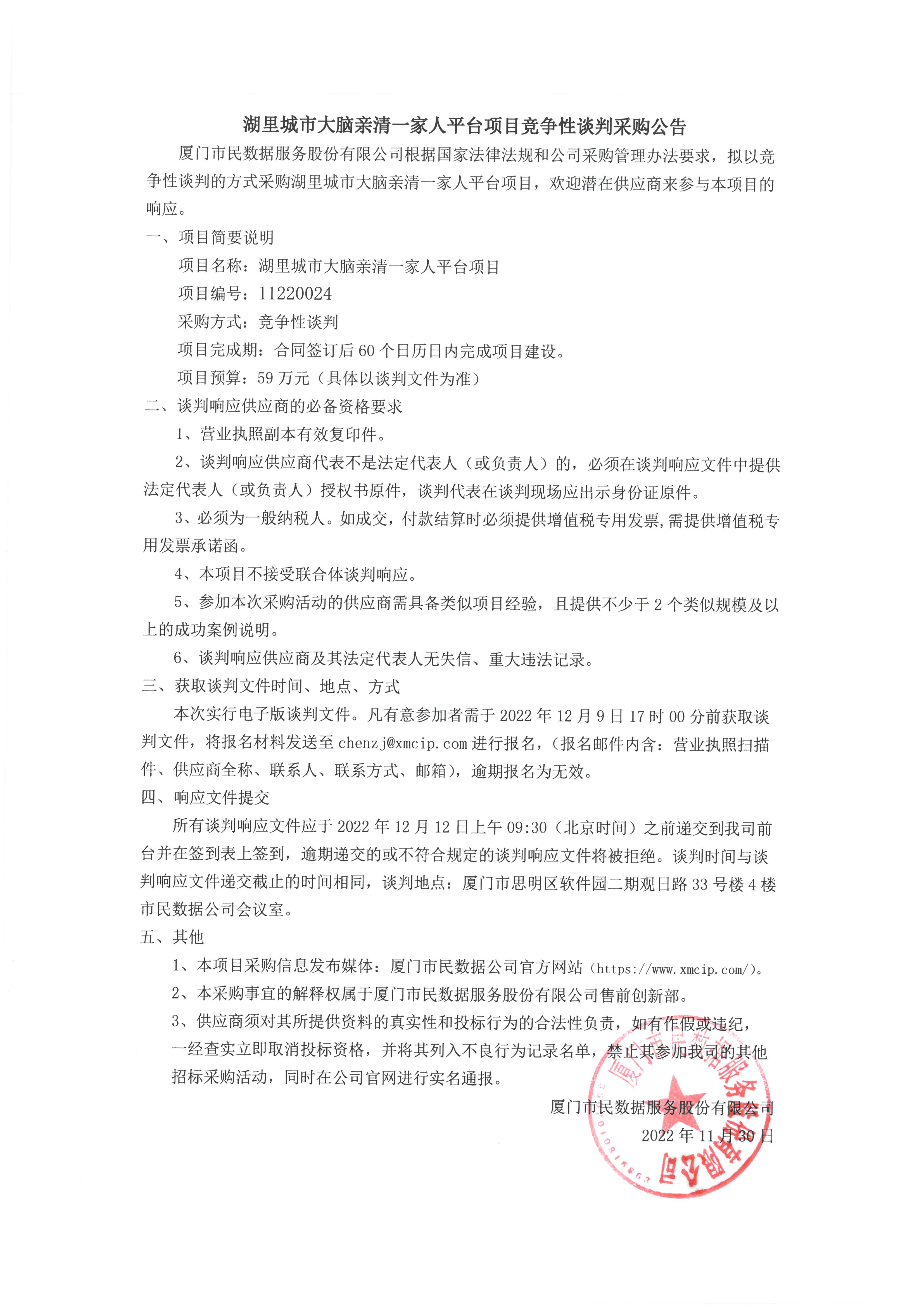 湖里城市大脑亲清一家人平台项目竞争性谈判采购公告