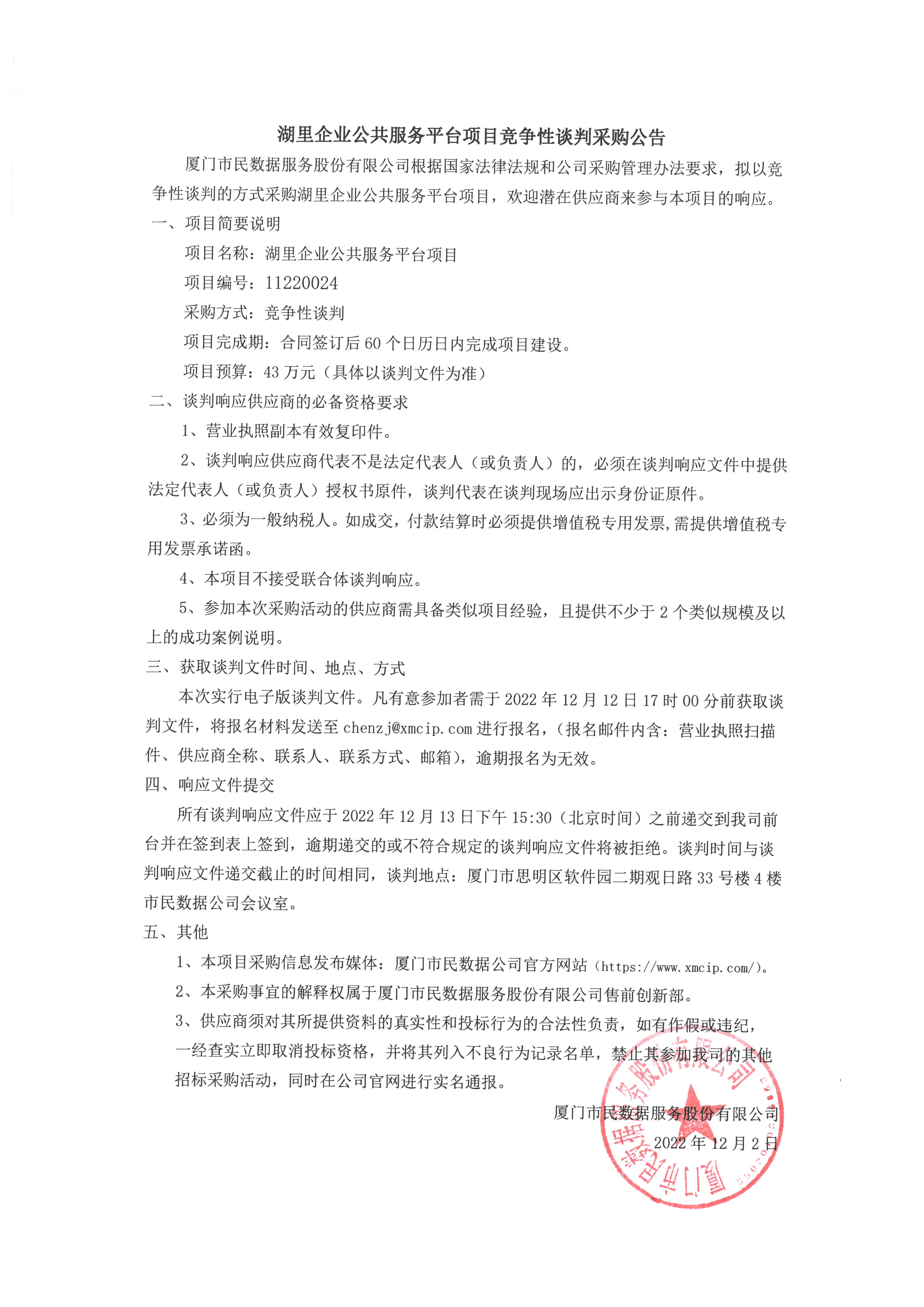 湖里企业公共服务平台项目竞争性谈判采购公告