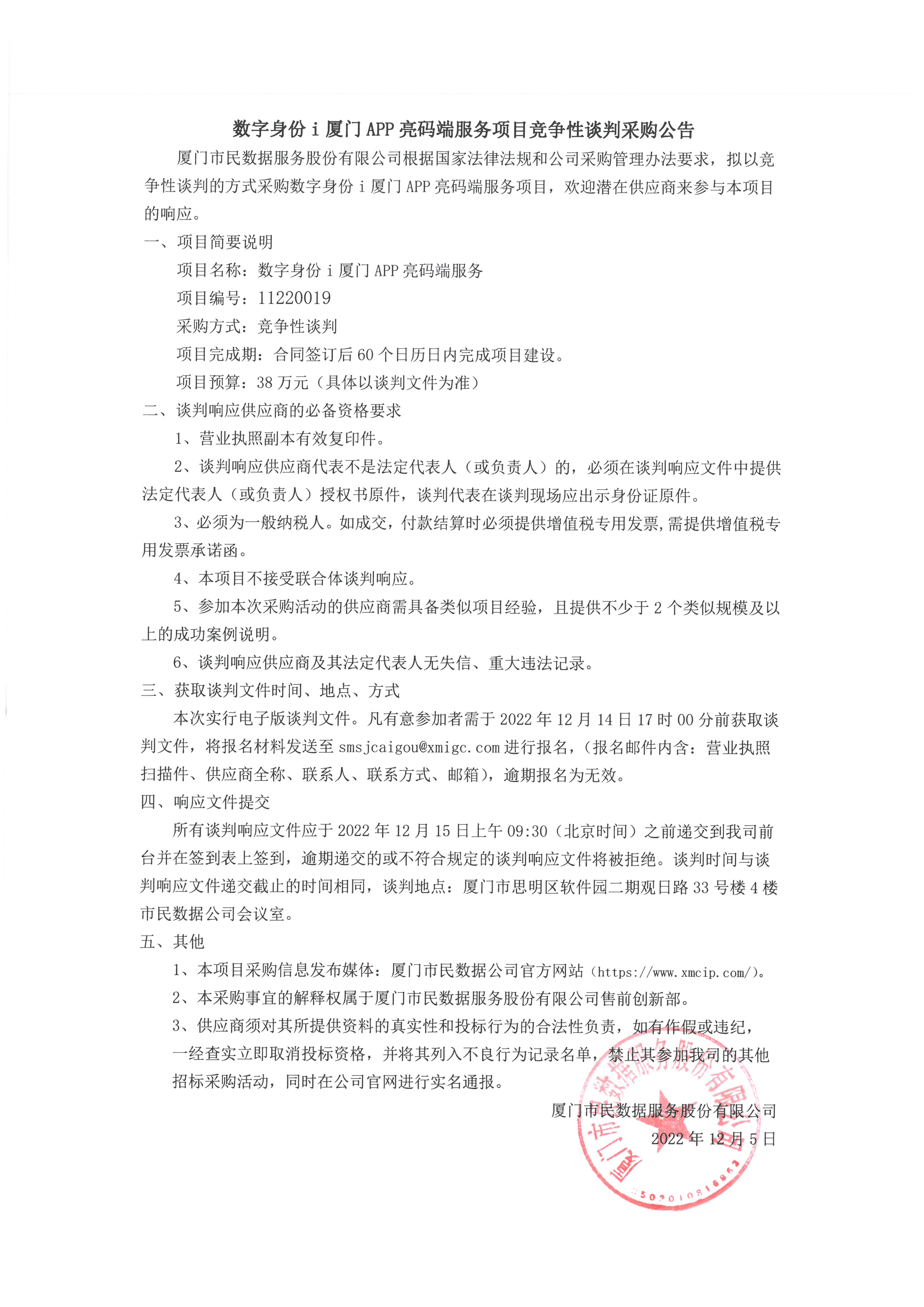 数字身份i厦门APP亮码端服务项目竞争性谈判采购公告