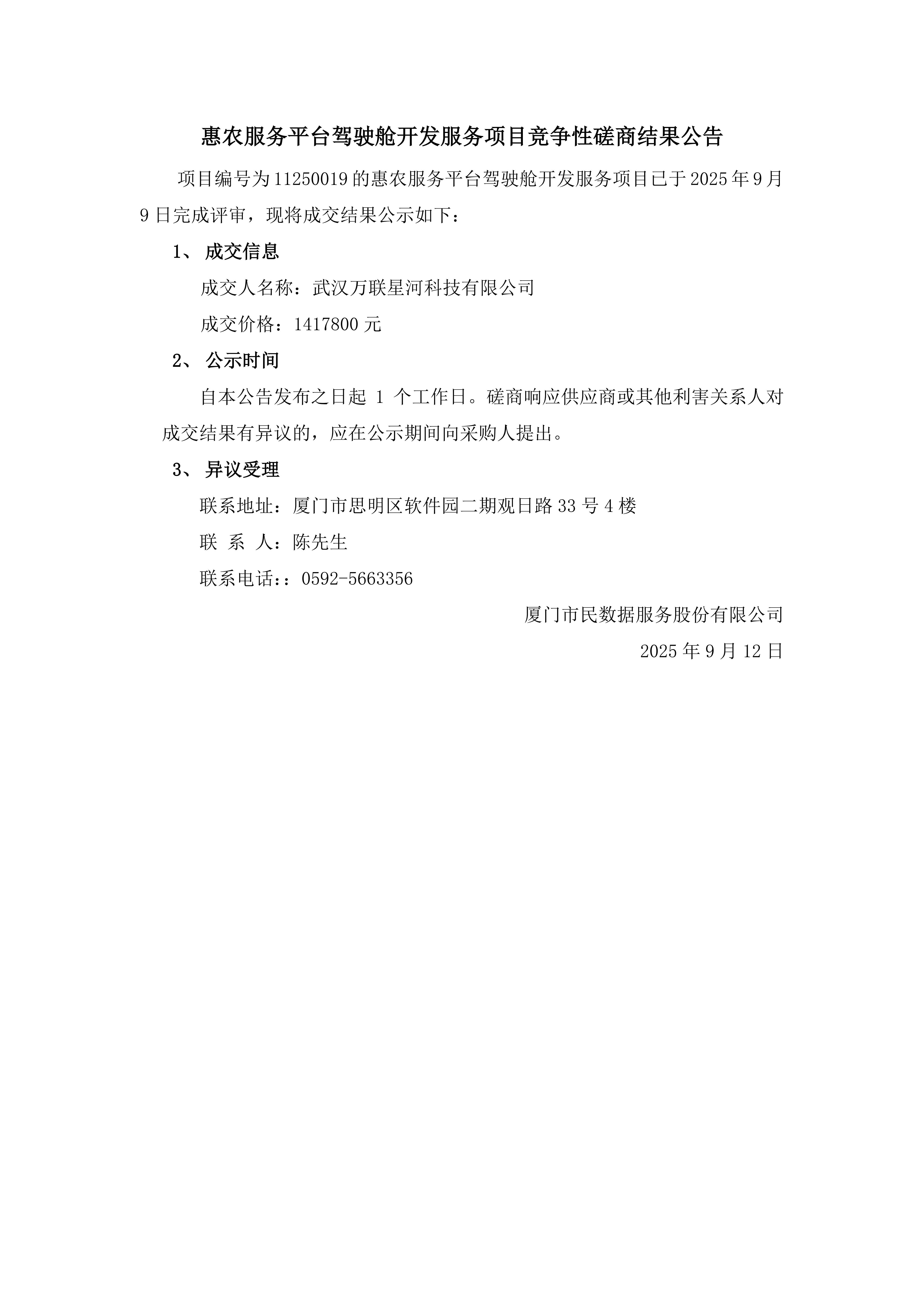 惠农服务平台驾驶舱开发服务项目竞争性磋商结果公告